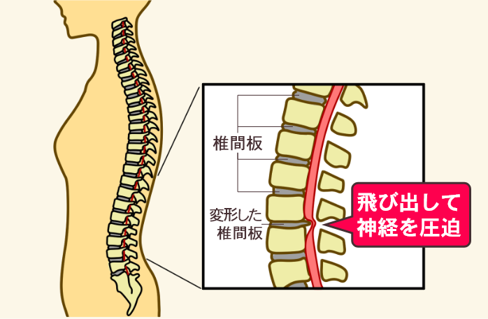 そもそもヘルニアとは「逸脱する」という意味で、 背骨の間の椎間板に負担がかかり、中の組織が外に飛びだすことを指します。